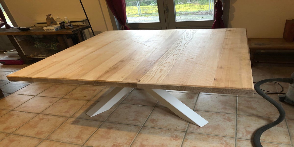 Table restaurée et modernisé. Nous avons recherché une vieille table correspondant au dimensions souhaitées par le client et remis à neuf et à son goût.